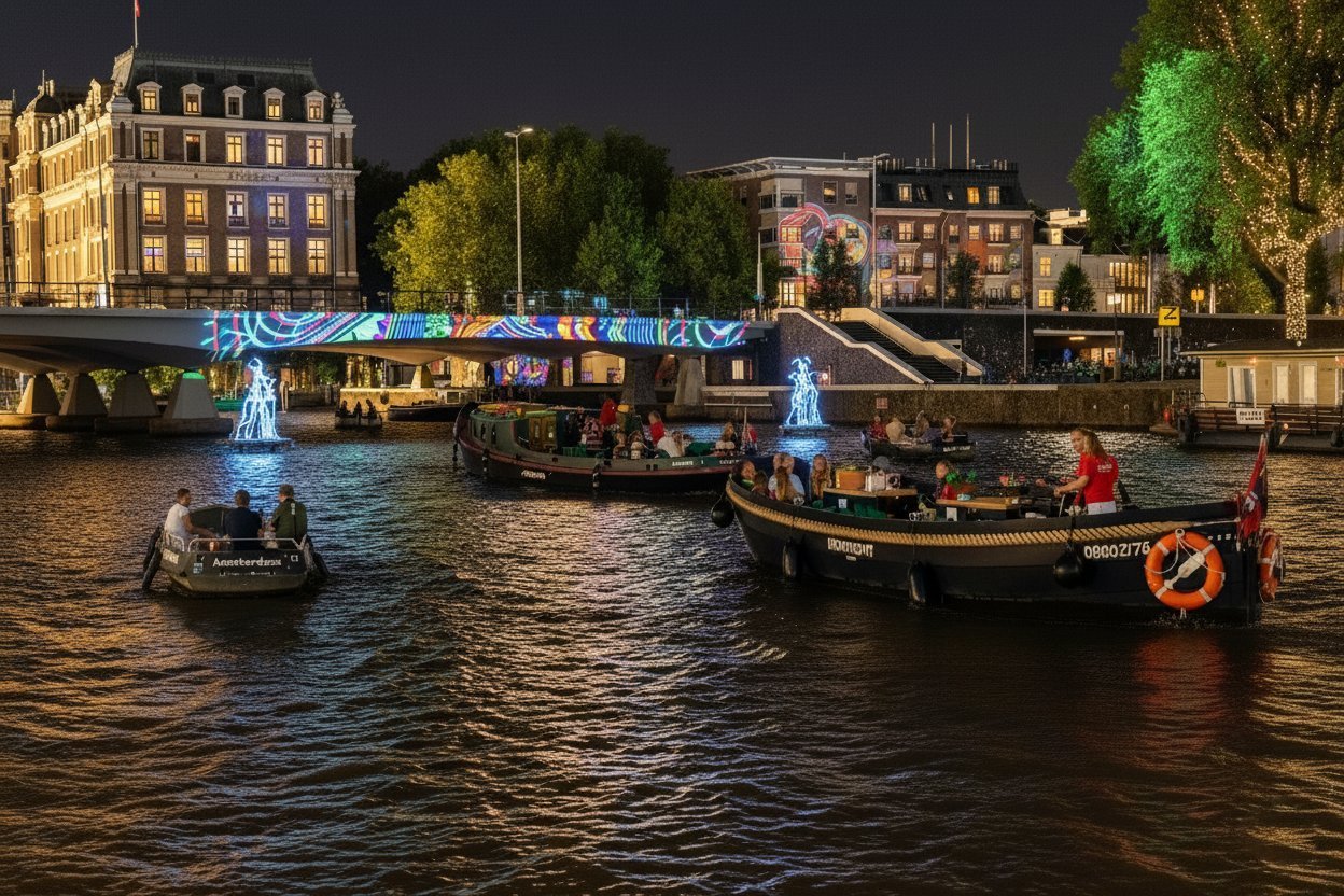 Die Grachten von Amsterdam glitzern im Licht, die Stadt ist still und bezaubernd schön, und du sitzt komfortabel an Bord. Während der 14. Ausgabe des Amsterdam Light Festivals (27. November 2025 bis 18. Januar 2026) fährt Mokumboot täglich aus und bietet drei Möglichkeiten, das Festival vom Wasser aus zu erleben.
