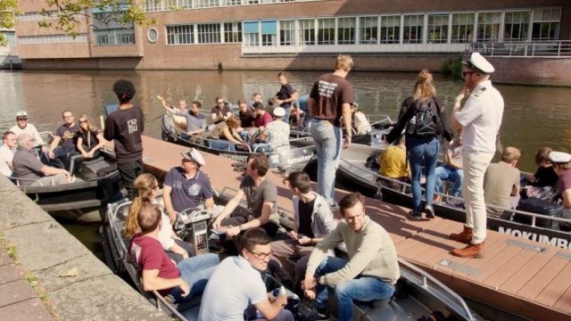 Michael, CEO bij Monsterevents, legt uit: “Er is geen schipper aan boord, dus medewerkers moeten onderling bepalen wie er de grachten gaat trotseren. Wordt dit de administratief medewerker of om de beurt? Of blijft de manager het liefst zoveel mogelijk aan het roer? Per sloep is er één iPad aan boord. Hierop staat de route en de vragen die onderweg beantwoord moeten worden. Omdat elke sloep gevuld is met een team van 8 personen, komen de verschillende sloepen met collega’s elkaar regelmatig tegen. Via een chatsysteem op de iPad kunnen de sloepen met elkaar in gesprek gaan.”